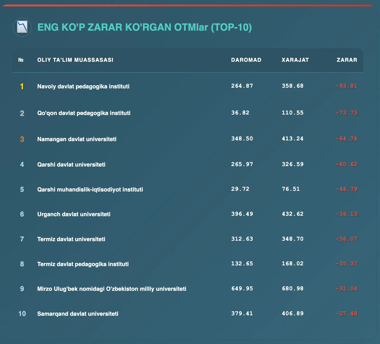 Biroq ayrim universitetlar yilni zarar bilan yakunlagan. Eng katta manfiy natija Navoiy davlat pedagogika institutida kuzatilgan — 93,8 mlrd soʻm zarar. Shuningdek, Qoʻqon davlat pedagogika instituti (73,7 mlrd soʻm) va Namangan davlat universiteti (64,7 mlrd soʻm) ham katta zarar qayd etgan OTMlar qatorida.